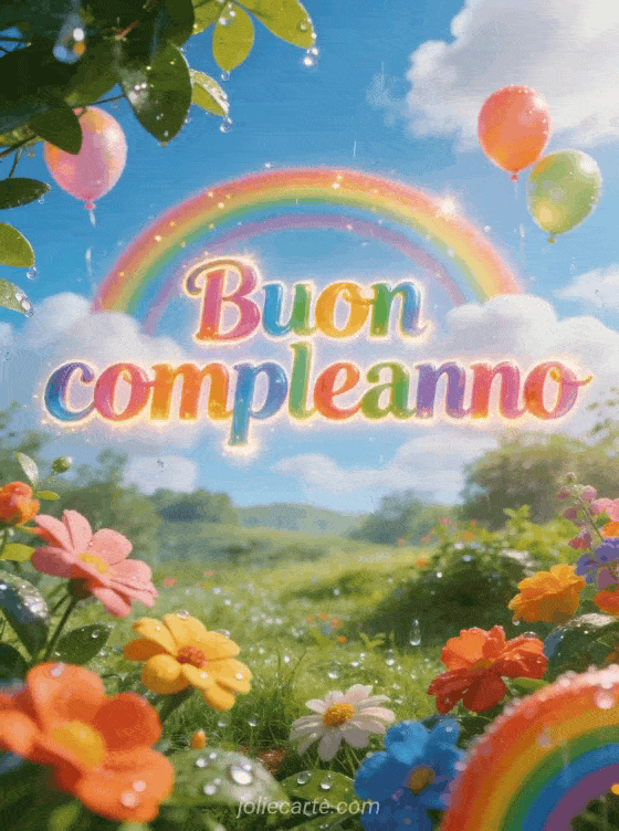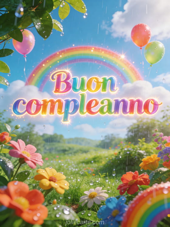 Condividi un augurio luminoso di buon compleanno con scritte multicolori arcobaleno, un arcobaleno completo su un paesaggio verde dopo la pioggia, fiori, palloncini arcobaleno, luce dorata e gocce d'acqua scintillanti. Puoi inviare anche buon compleanno auguri, un biglietto di fiore buon compleanno o un biglietto di buon compleanno gatto.