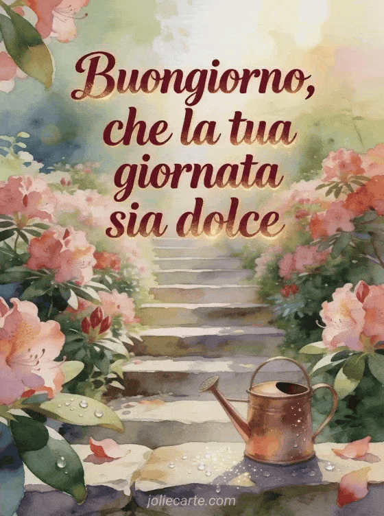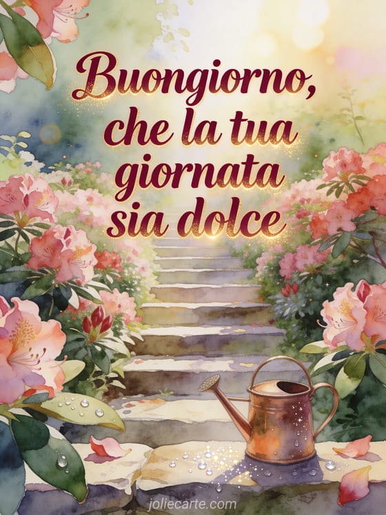 Invia un carino messaggio di buongiorno con lettere bordeaux calde ad acquerello, una scala da giardino fiancheggiata da rododendri, un piccolo annaffiatoio di rame e rugiada scintillante sulla pietra. Scopri anche messaggio carino di buongiorno con tenerezza al mattino, messaggio di buongiorno per lei o messaggio di buongiorno a un'amica.