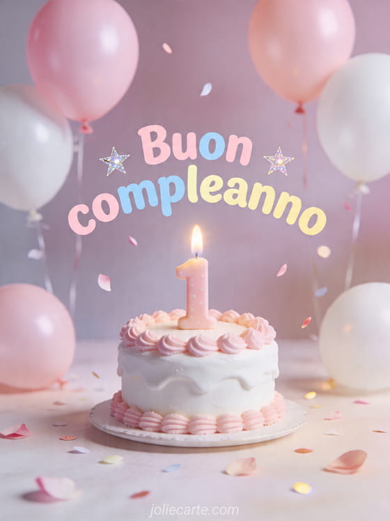 Festeggia un dolce primo compleanno con questo biglietto morbido e fotorealistico pieno di palloncini pastello e una piccola torta. Scopri anche cartoline animate di compleanno jolie carte, e-card compleanno animata o cartolina animata gratis compleanno fiori.