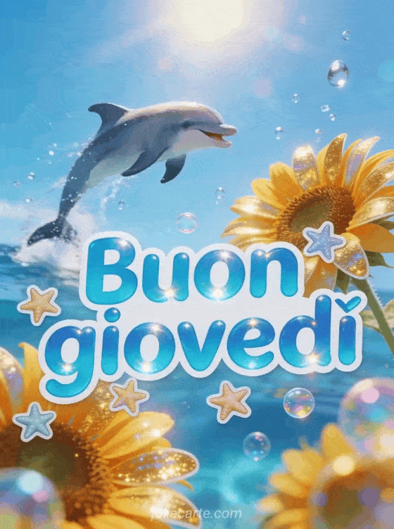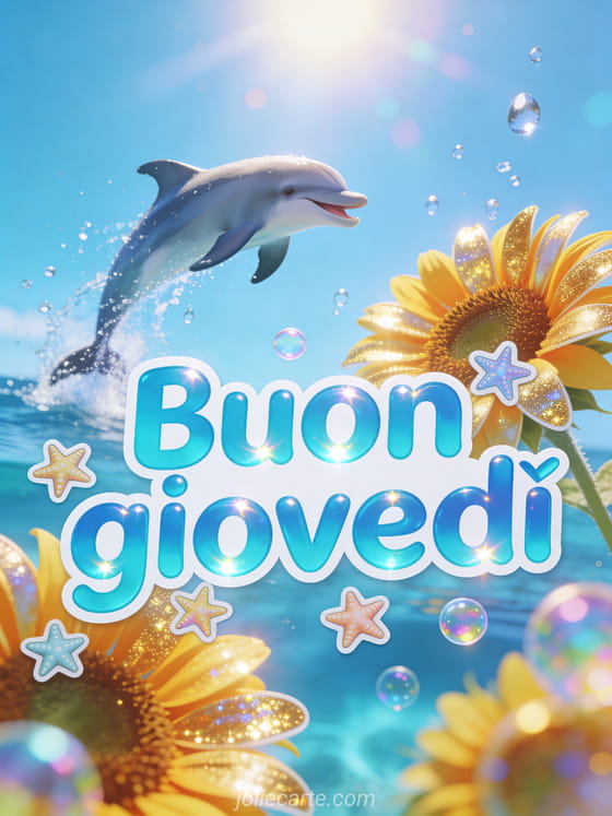 Invia un saluto gioioso di buon giovedì con lettere turchesi vivaci, stelle marine, bolle iridescenti, girasoli luminosi in primo piano e un delfino che salta fuori dall'acqua sotto una luce solare intensa. Puoi vedere anche questi buon giovedì baci, questa buongiorno buon giovedì cartolina o questa augurare un buon giovedì in immagine.