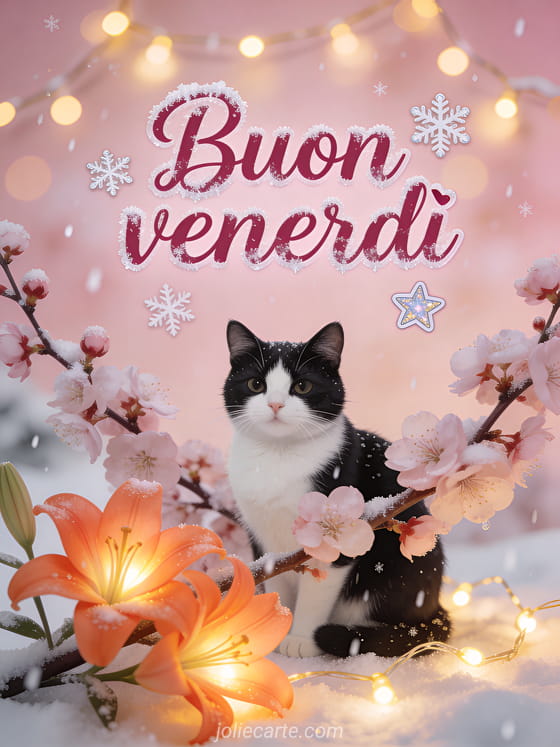 Invia una cartolina animata buon venerdì con lettere corsive rosa scuro, fiocchi gelati, fiori di ciliegio e un gatto tuxedo bianco e nero tra i rami. Condividi un augurio accogliente di fine settimana e scopri anche buon venerdì divertente umorismo, buon venerdì fiori immagini o cartolina buona giornata venerdì.