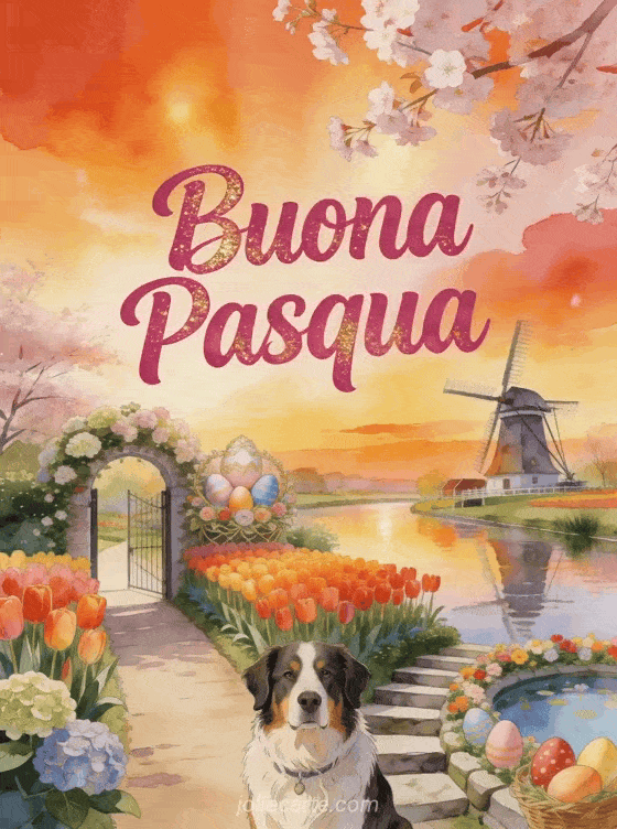 Festeggia la Pasqua con questo incantevole biglietto animato gratuito con un pastore australiano all'ingresso di un sentiero di Keukenhof con tulipani nelle tonalità del tramonto, un mulino olandese riflesso in un canale e uova di Pasqua tra le ortensie. Scopri anche cartes virtuelles joyeuses paques gifs joyeuses paques.