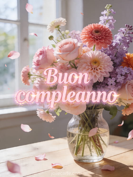 Invia un buon compleanno luminoso con questa cartolina floreale ricca di rose, dalie, ranuncoli e lillà. Puoi anche scoprire un dromedario biglietto compleanno animato gratis musicale via sms, una candelina compleanno gif animata o una buon compleanno gif animata.