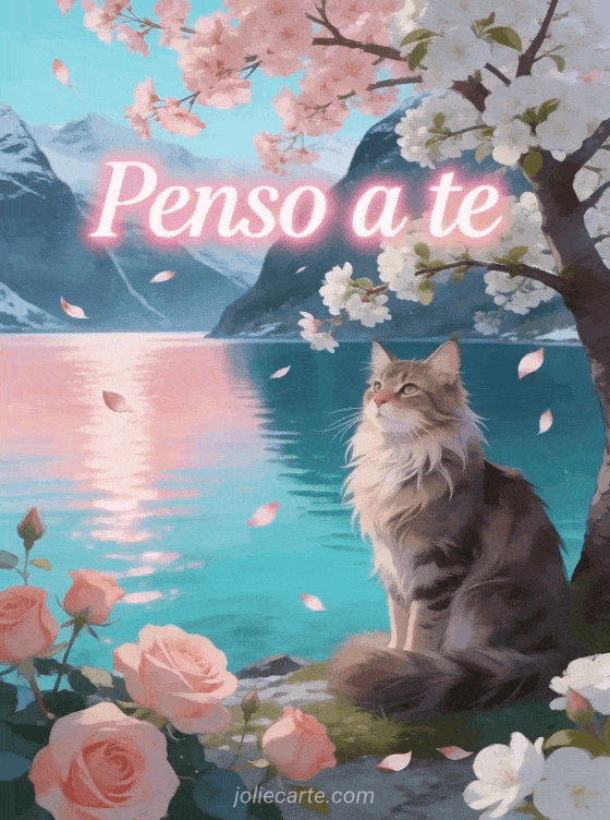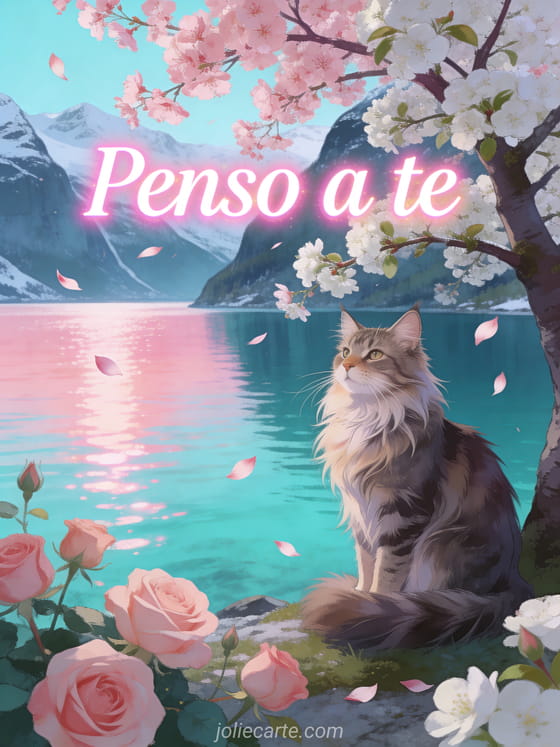 Condividi questa bellissima cartolina animata penso a te con ciliegi in fiore su un fiordo turchese e un maestoso gatto Maine Coon. Scopri anche una cartolina ti penso tanto o immagine gratuita penso a te.