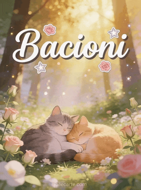 Condividi l'amore con questa adorabile cartolina di bacioni con due gatti coccolati in una radura piena di fiori. Scopri anche teneri baci animati o baci clipart gratis.