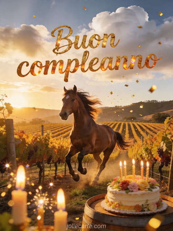 Condividi un caloroso augurio di compleanno con questo festoso biglietto con un cavallo marrone al galoppo in un vigneto dorato, candele scintillanti e una torta con fiori su una botte. Scopri anche compleanno figlia gif, biglietto buon compleanno bambina e cartolina animata di compleanno per mia figlia.