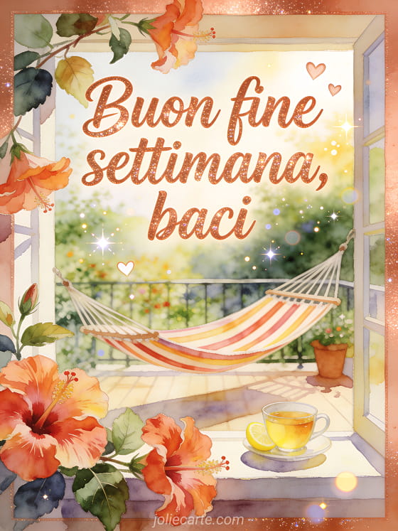Condividi il calore del fine settimana con scritte rame ad acquerello, petali vivaci di ibisco oltre il bordo, una terrazza di giardino soleggiata, un'amaca a righe e una tazza di tè al limone. Scopri anche un buon fine settimana baci immagini, un biglietto molti baci e buon weekend o un saluto buon weekend e tanti baci.