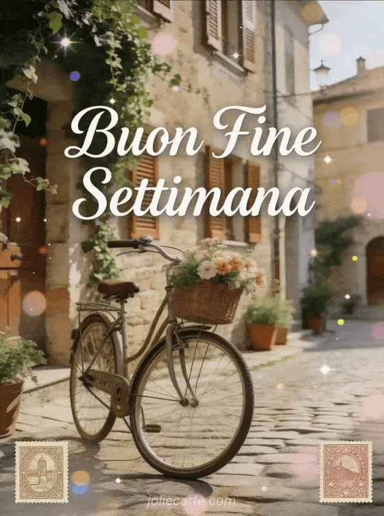 Augura un buon fine settimana con questa incantevole cartolina vintage che presenta una bicicletta d'epoca con cesto di fiori su una strada acciottolata di un villaggio europeo con muri ricoperti di edera. Scopri anche un buon fine settimana soleggiato o un gif buon fine settimana divertente.