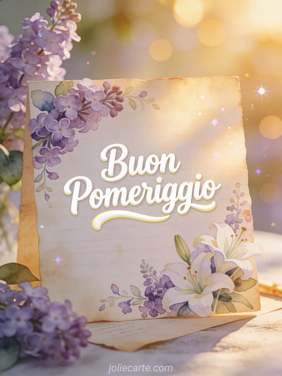 Condividi eleganza con questa cartolina di buon pomeriggio con un bellissimo bordo floral in acquerello di lillà e gigli su carta vintage. Scopri anche una cartolina di augurandovi un buon pomeriggio o di gif buon pomeriggio soleggiato.