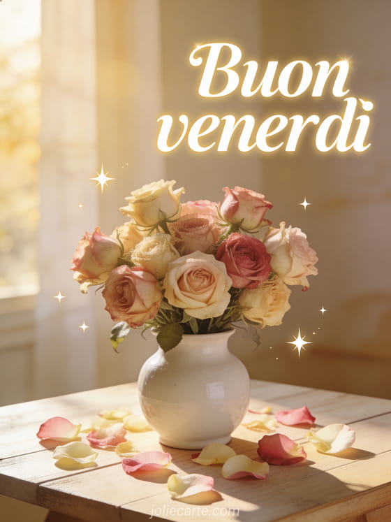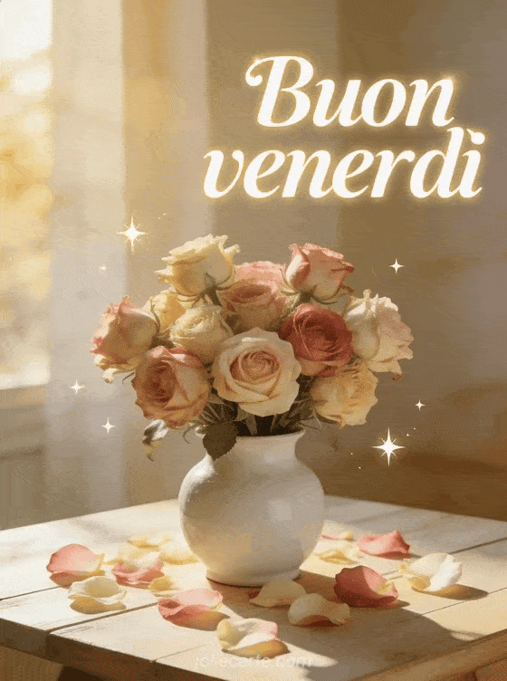 Invia un buon venerdì delicato con un bouquet di rose antiche in un vaso di ceramica bianca, luce morbida del mattino e dettagli scintillanti raffinati. Scopri anche buon venerdì divertente umorismo gif, buon venerdì baci gif animate o una frase buongiorno venerdì.