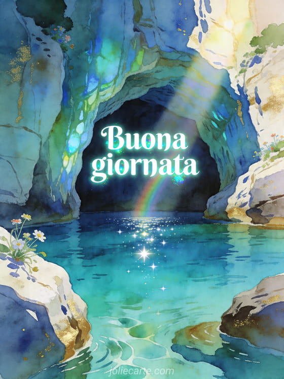 Condividi un luminoso Buona giornata con la Grotta Azzurra di Capri, acqua brillante e un sottile arcobaleno. Scopri anche messaggio buon lunedì e buona settimana citazione, cartolina virtuale buon lunedì e e-card buon lunedì.