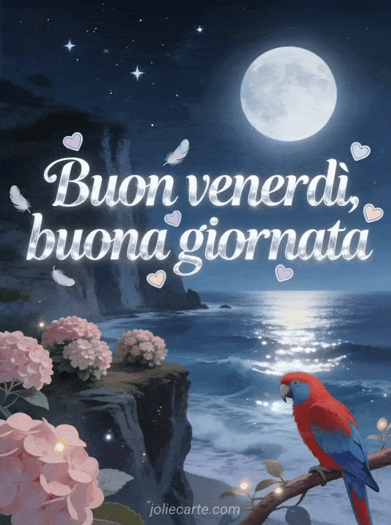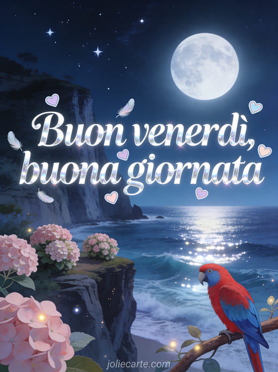 Invia una cartolina buona giornata venerdì con lettere bianche eleganti, riflessi argentati, cuori pastello e una scogliera costiera al chiaro di luna sopra il mare. Condividi un augurio poetico di fine settimana e scopri anche citazione zen buon venerdì, buon venerdì e buon weekend o immagine buon venerdì baci.