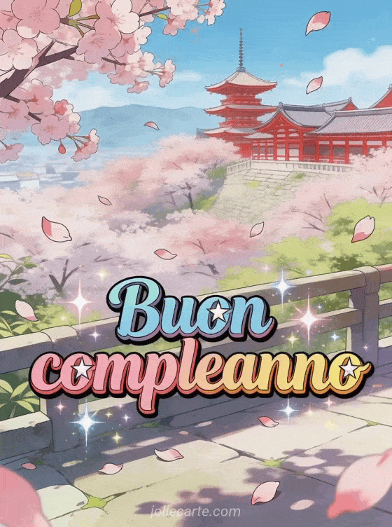 Festeggia con una cartolina di compleanno animata ispirata al Giappone, con ciliegi, petali che volano e tempio rosso sullo sfondo. Scopri anche immagine animata buon compleanno, compleanno animato e compleanno immagini animate.