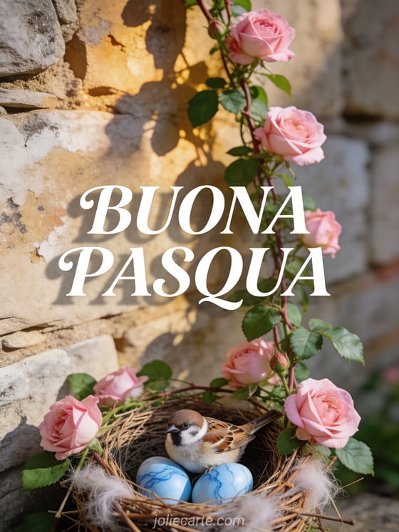 Un nido accogliente con un piccolo passero e uova marmorizzate blu e crema in un rosaio rampicante rosa in fiore — una tenera e poetica cartolina di Pasqua. Scopri anche una e-card Pasqua, un testo biglietto auguri Pasqua o una gallina di Pasqua.