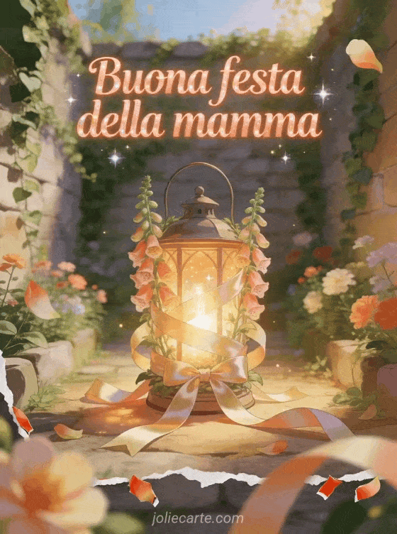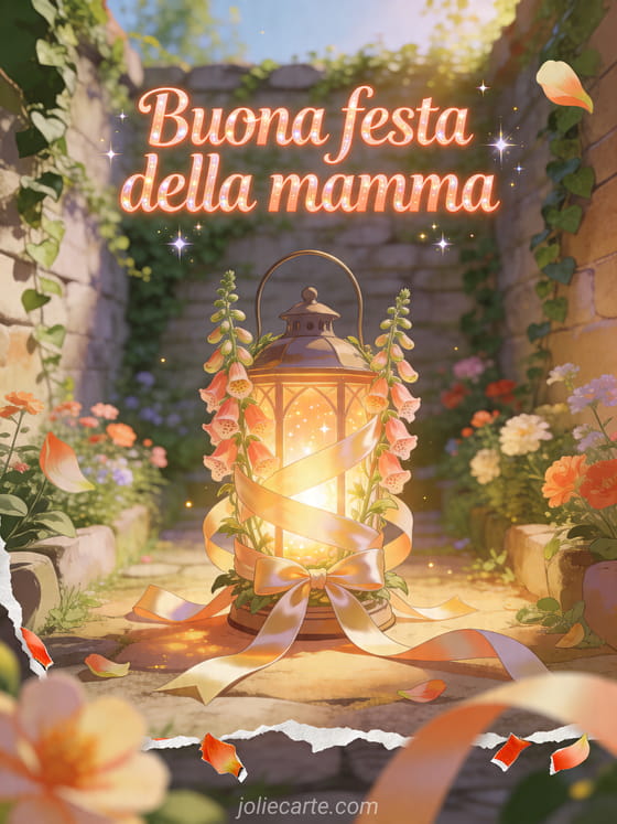 Condividi una cartolina festa della mamma con una lanterna luminosa avvolta da digitali e nastri satinati in un giardino murato radioso e pieno di scintille. Scopri anche buona festa della mamma super mamma, una lettera per la festa della mamma o parole sulla festa della mamma.