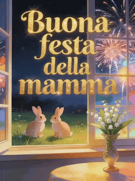Festeggia la mamma con questa festosa cartolina gioiosa per la festa della mamma con lettere dorate e due conigli vicino a una finestra con fuochi d'artificio spettacolari. Scopri anche biglietti festa della mamma gratuiti o buona festa della mamma fiori.