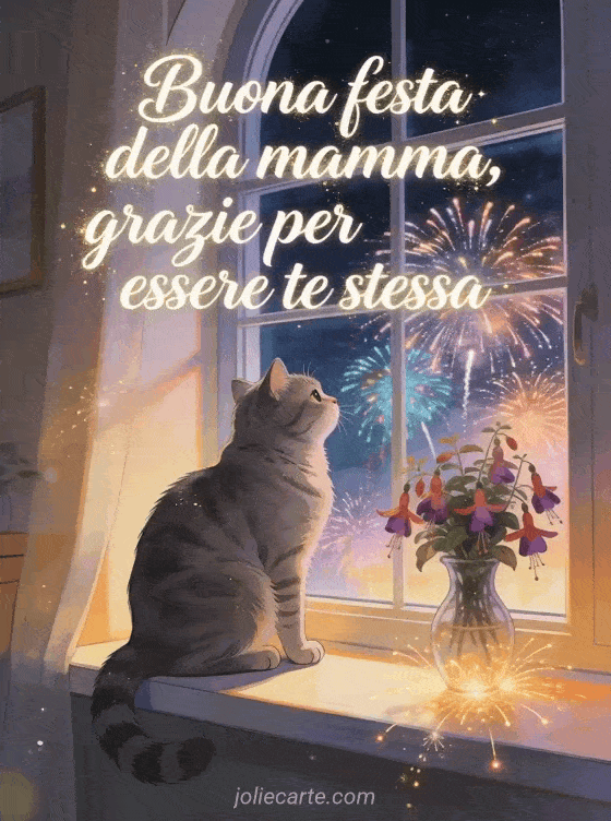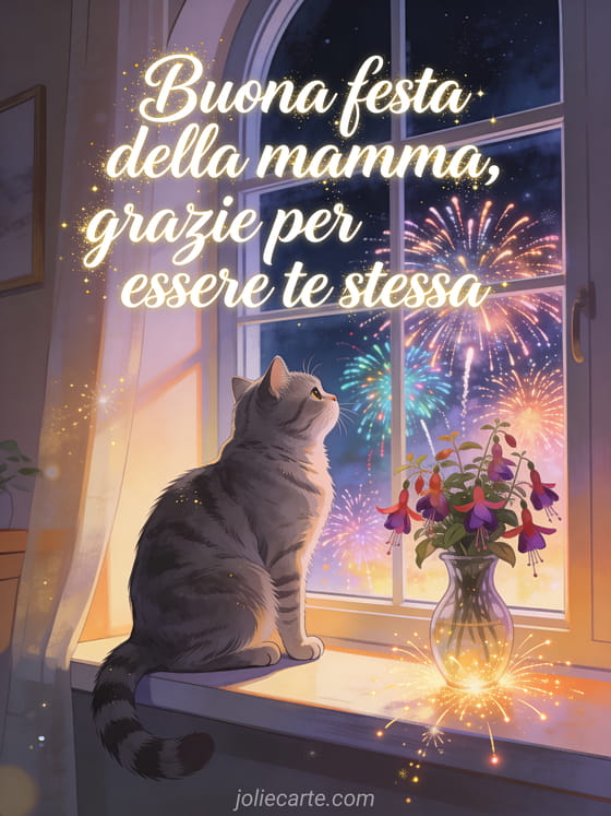Sorprendila con questa magica cartolina originale festa della mamma. Un gatto british shorthair grigio siede sul davanzale a guardare fuochi d'artificio spettacolari, con un vaso di fuchsie e brillantini dorati. Scopri anche un biglietto festa della mamma gratis o un testo biglietto festa della mamma.