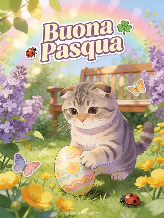 Un gatto Scottish Fold che gioca con un uovo di Pasqua decorato tra lillà e ranuncoli in un giardino primaverile — un'allegra cartolina di Pasqua gratis. Scopri anche fiori di Pasqua immagini, belle cartoline di Pasqua o un testo buona Pasqua.