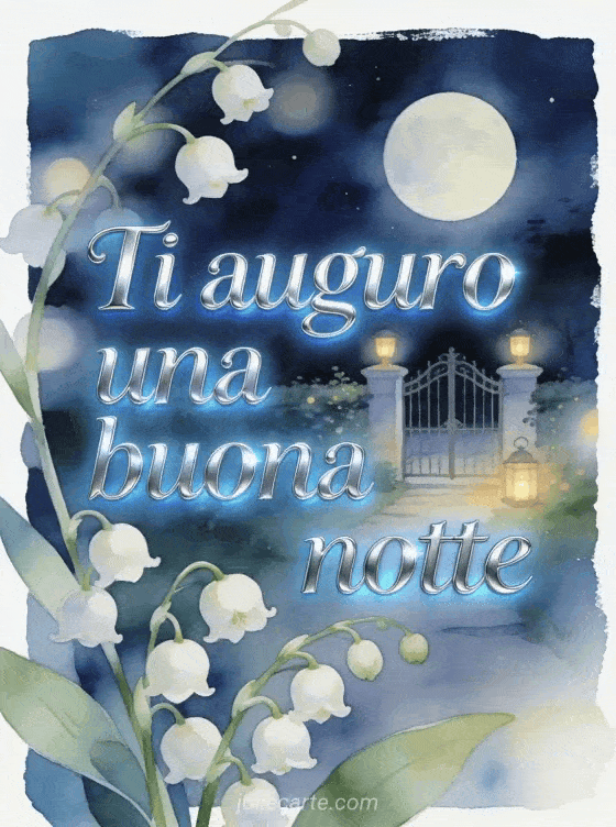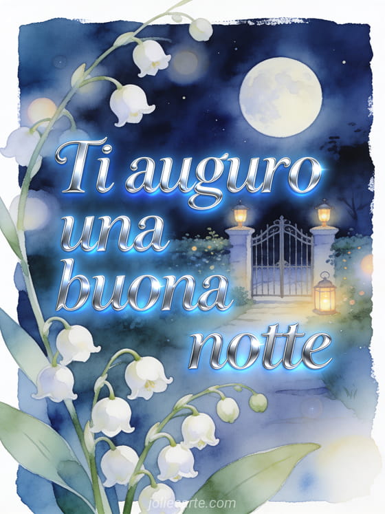 Augura buona notte con un dolce cancello da giardino ad acquerello sotto una luna rotonda, piccole luci di lanterna e mughetto in primo piano. Puoi inviare anche una buonanotte cartolina, un carino messaggio della buonanotte o un bel messaggio per dire buonanotte.