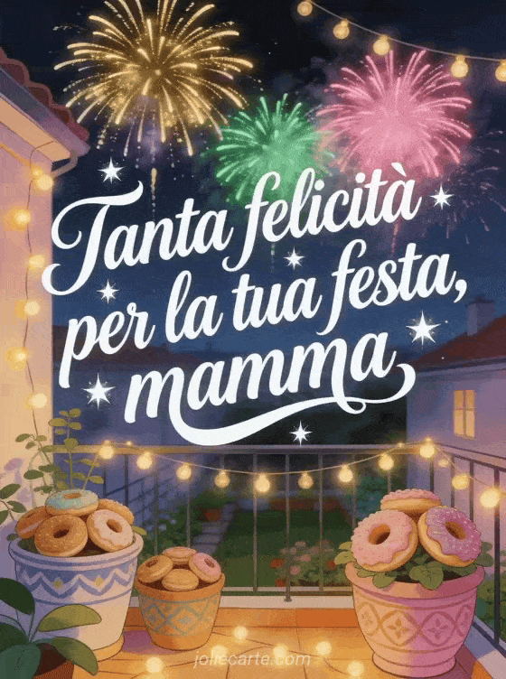 Festeggia con questa vivace cartolina per la festa della mamma. Un giardino sul tetto di notte con spettacolari fuochi d'artificio che dipingono il cielo di oro, verde e rosa, bellissimi garofani in vasi decorativi e morbide lucine. Scopri anche un auguri festa della mamma o un auguri per la festa della mamma.