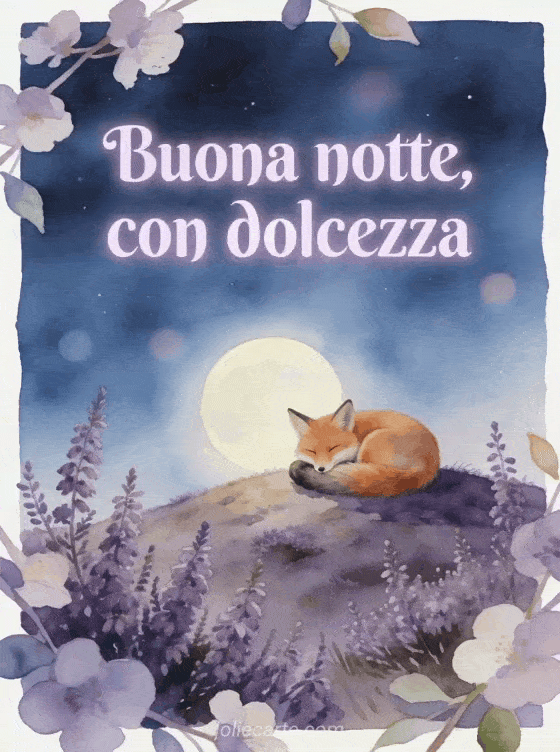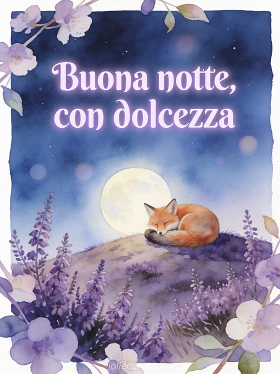 Condividi un tenero messaggio di buonanotte con una volpe rannicchiata vicino a una collina di erica illuminata dalla luna, fiori viola e morbida luce blu della notte in acquerello. Scopri anche cartolina animata buonanotte, messaggio per augurare buonanotte o buona serata e buonanotte messaggio.