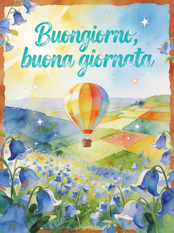 Invia una cartolina virtuale animata di buongiorno con lettere turchesi vivaci ad acquerello, una mongolfiera luminosa sopra una valle di campanule e campi a mosaico. Scopri anche un messaggio di buongiorno per la mia ragazza, cartoline di buongiorno gratuite o cartoline di buongiorno per amici.