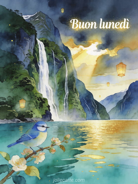 Invia un tranquillo Buon lunedì con cascate maestose, un fiordo calmo e una delicata cinciarella. Scopri anche e-card buon lunedì, cartolina buon lunedì e buongiorno del lunedì mattina.