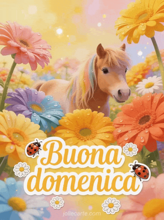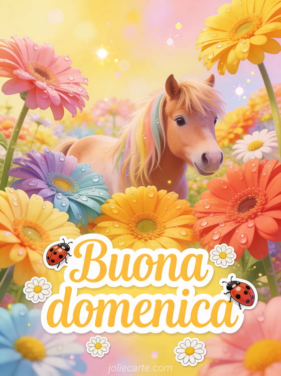 Invia una buona domenica colorata con gerbere luminose, coccinelle, margherite e un adorabile pony shetland nella calda luce dorata. Scopri anche buona domenica gif animata, belle immagini buona domenica baci o una bella cartolina buona domenica soleggiata.