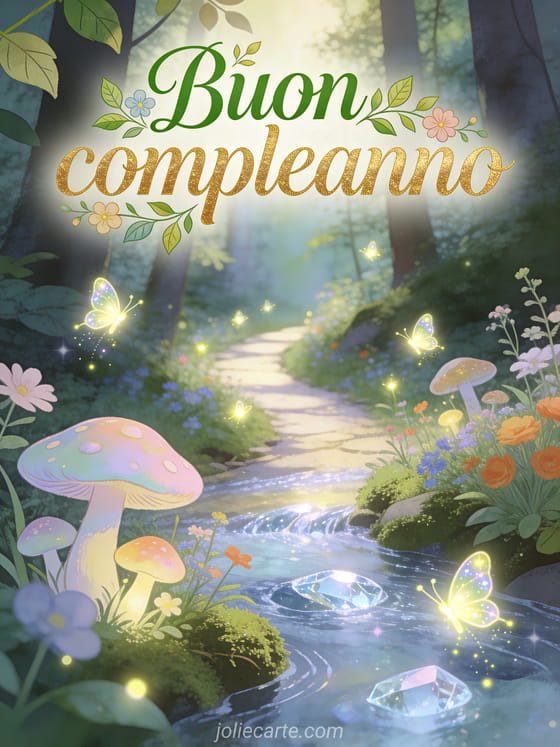 Delizia i tuoi cari con questa cartolina virtuale di compleanno animata con un sentiero di bosco incantato con lucciole luminose e funghi magici. Scopri anche una cartolina compleanno animata dromedario musicale gratis o cartoline di auguri compleanno animate gratis per altre opzioni.