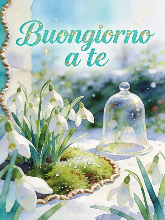 Invia una cartolina virtuale di buongiorno con lettere aqua luminose ad acquerello, bucaneve, una campana di vetro e muschio brillante di rugiada in un fresco angolo di giardino. Scopri anche messaggio di buongiorno per il mio uomo, messaggio di buongiorno a un amico o messaggio di buongiorno per la mattina.