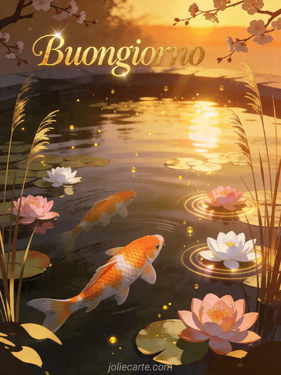 Condividi un sereno saluto del buongiorno con un laghetto zen, carpe koi luminose e ninfee in fiore al tramonto. Scopri anche buongiorno novembre immagini, poesia del buongiorno commovente e amicizia buongiorno messaggio del mattino.