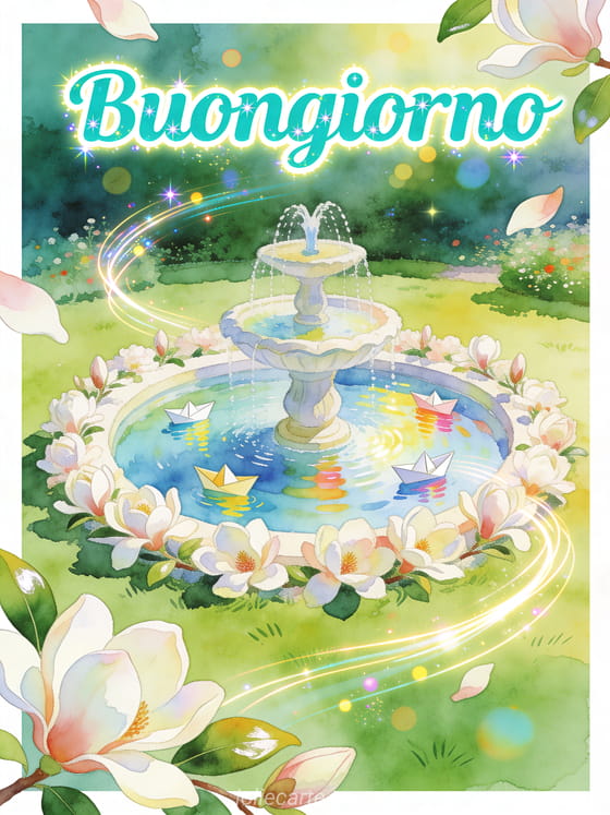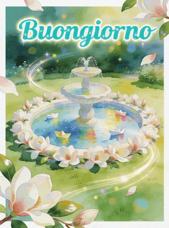 Invia cartoline animate di buongiorno con vivaci lettere turchesi ad acquerello, una fontana giocosa in giardino, magnolie e barchette di carta che galleggiano. Scopri anche biglietto virtuale buongiorno a te, messaggio di buongiorno del mattino per persona speciale o messaggio di buongiorno per la tua crush.