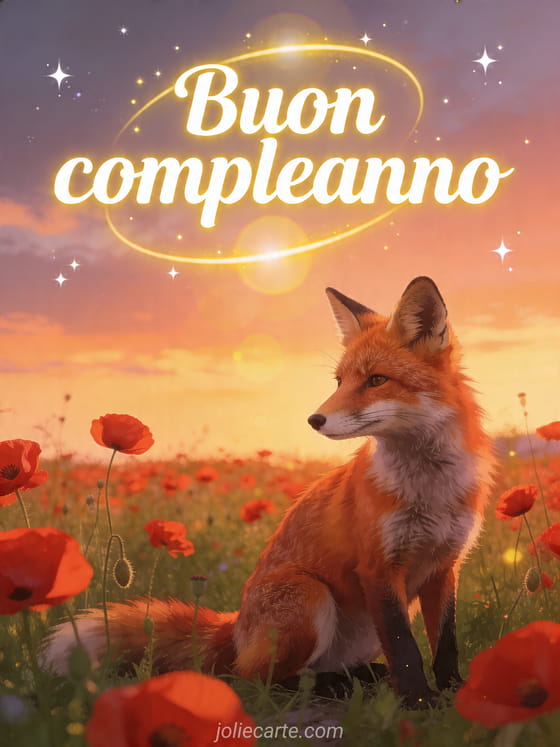 Condividi un augurio di compleanno poetico con questo caldo biglietto illustrato con una volpe rossa in un campo di papaveri, stelle scintillanti e luce dorata del crepuscolo. Scopri anche e-card compleanno animata, cartolina animata gratis compleanno fiori e dromedario biglietto compleanno animato gratis musicale via sms.