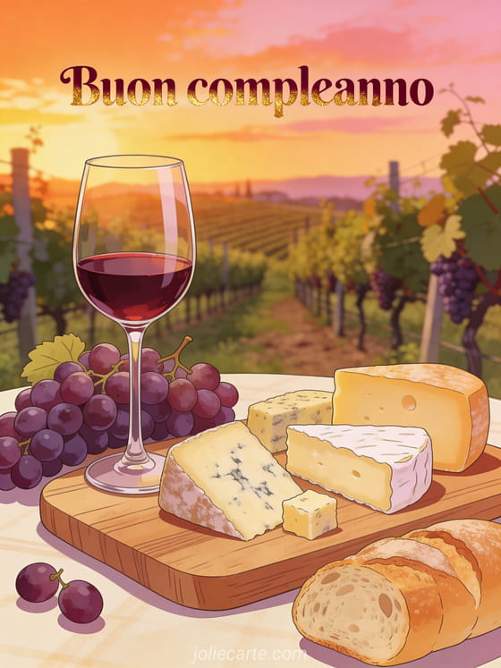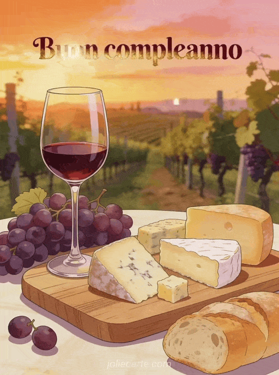 Festeggia con una cartolina animata di compleanno per adulti con vino, uva, formaggio e vigneto dorato al tramonto. Scopri anche cartoline compleanno animate gratis dromadaire, dromadaire cartoline compleanno animate e animato buon compleanno gatto.