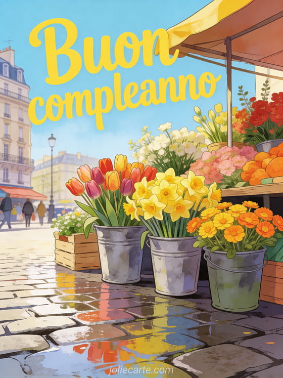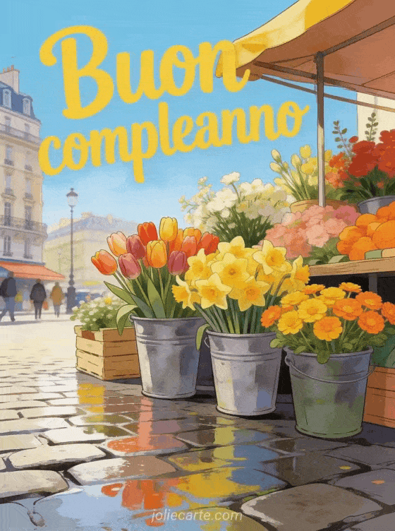 Festeggia con una cartolina animata di compleanno gratis ispirata a un colorato mercato floreale primaverile pieno di tulipani, narcisi e ranuncoli. Scopri anche dromadaire cartoline compleanno animate, animato buon compleanno gatto e gif animata buon compleanno gatto gif.