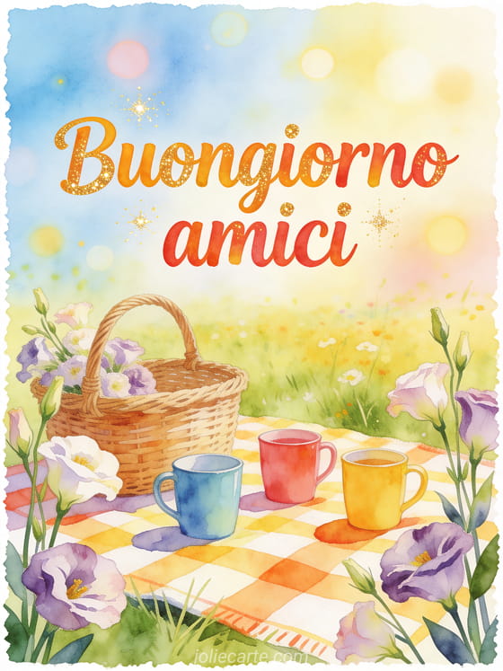 Invia cartoline di buongiorno per amici con lettere audaci e gioiose ad acquerello, tre tazze colorate, un cestino da picnic intrecciato e lisianto attorno a una tovaglia a quadri luminosa. Scopri anche messaggio buongiorno immagine, messaggio di buongiorno per mia moglie o carino messaggio di buongiorno.