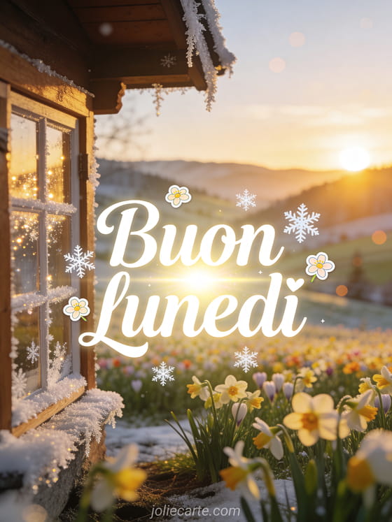 Invia cartoline gratis buon lunedì con lettere bianche eleganti, fiocchi di neve, piccole margherite e una valle fiorita all'alba dorata. Condividi un augurio fresco per iniziare la settimana e scopri anche buon lunedì baci gif, belle immagini buongiorno lunedì o gif scintillante buon lunedì scintillante.