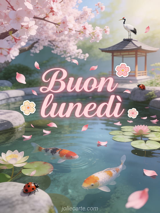 Invia un buon lunedì sereno con un laghetto zen giapponese, carpe koi colorate, ninfee, ciliegi in fiore e una cicogna sul tetto di un padiglione. Scopri anche buon lunedì immagine scintillante, buon lunedì buona settimana gif animata o buon lunedì baci gifs.