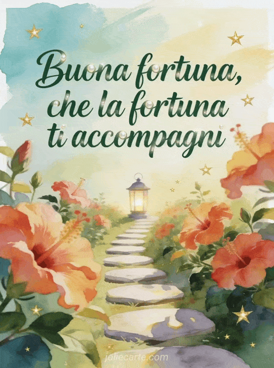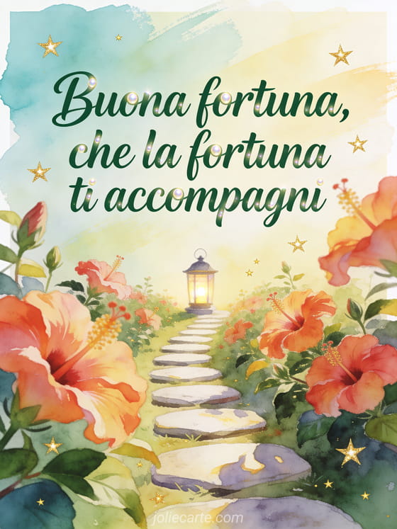 Incoraggia qualcuno con una cartolina poetica di buona fortuna, con un sentiero luminoso di pietre tra ibischi verso una piccola lanterna e stelle dorate. Scopri anche una buona fortuna quadrifoglio immagine, un buona fortuna nuovo lavoro biglietto o una immagine per dire buona fortuna.