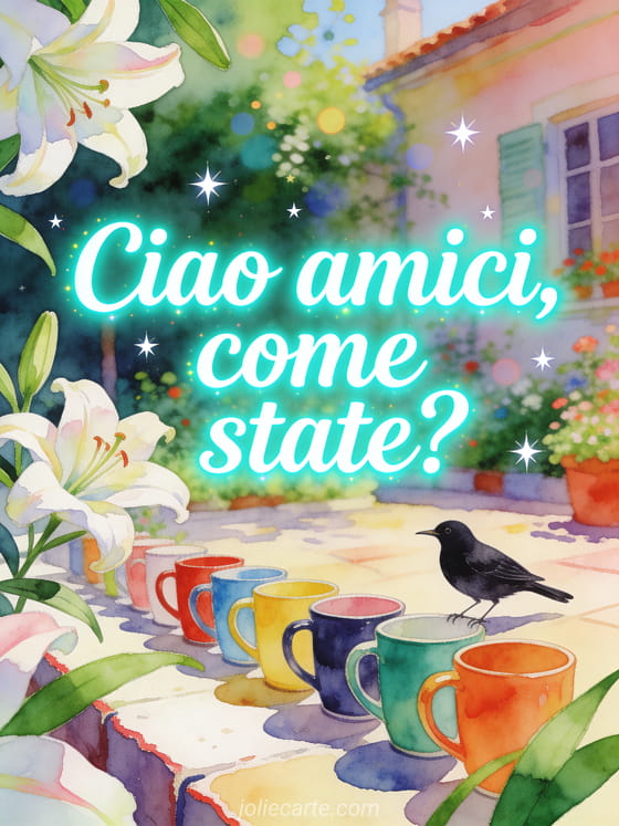 Inizia una conversazione allegra con gigli, un merlo e tazze colorate in un vivace cortile giardino dipinto ad acquerello. Puoi inviare anche come sta mio nipote, ciao tesoro mio come stai o come stai figlia mia.