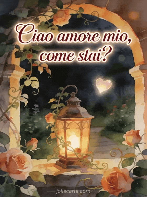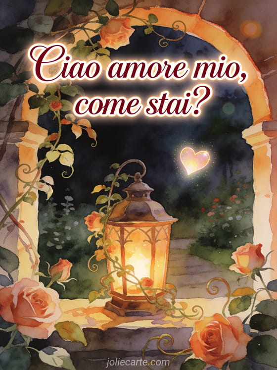 Condividi un saluto romantico e tenero con tralci di rose antiche intorno a una lanterna luminosa in una nicchia di giardino, luce ambrata e bagliori a cuore. Puoi inviare anche come va piccolo tesoro mio, buongiorno amore mio come stai stamattina o come va il mio tesoro.