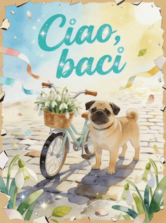 Condividi un biglietto luminoso con scritta turchese, un carlino accanto a un piccolo cestino da bicicletta pieno di bucaneve, festoni di carta e ciottoli al sole. Puoi inviare anche gifs ciao buona giornata, belle immagini ciao buongiorno o ciao gif.