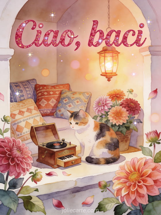 Condividi un ciao dolce con scritte color lampone, un gatto calico, un carillon e dalie in una nicchia accogliente piena di cuscini. Puoi inviare anche buona giornata ciao buongiorno gif, ciao buongiorno gif o ciao baci gif animata.