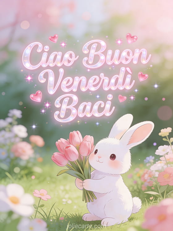 Invia un tenero messaggio di buon venerdì con baci e affetto. Un adorabile coniglietto bianco con un bouquet di tulipani rosa per augurare un meraviglioso venerdì. Scopri anche una cartolina buon venerdì e buon fine settimana o una cartolina venerdì piovoso.