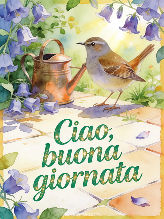 Condividi un ciao fresco con scritte smeraldo, campanule oltre il bordo e un usignolo vicino a un annaffiatoio di rame su piastrelle luminose da giardino. Puoi inviare anche immagini di ciao buongiorno, buongiorno ciao gif o ciao baci gif carina.