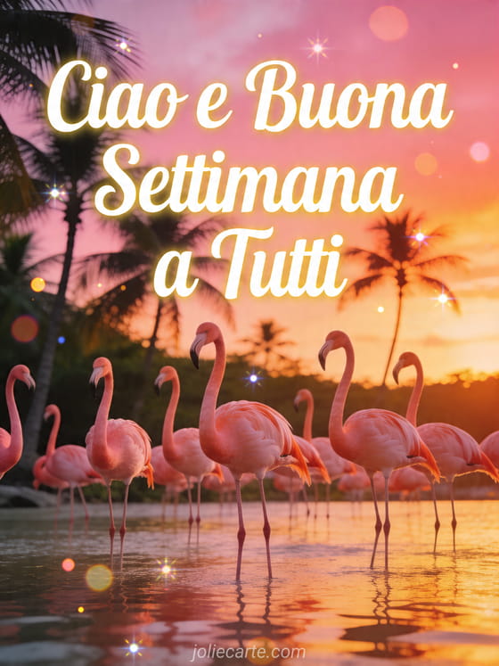 Condividi un allegro Ciao e buona settimana a tutti con questa cartolina gratis che mostra fenicotteri rosa in acque tropicali al tramonto. Scopri anche cuore ciao buona settimana, buona settimana immagine o immagine ciao e buona settimana.