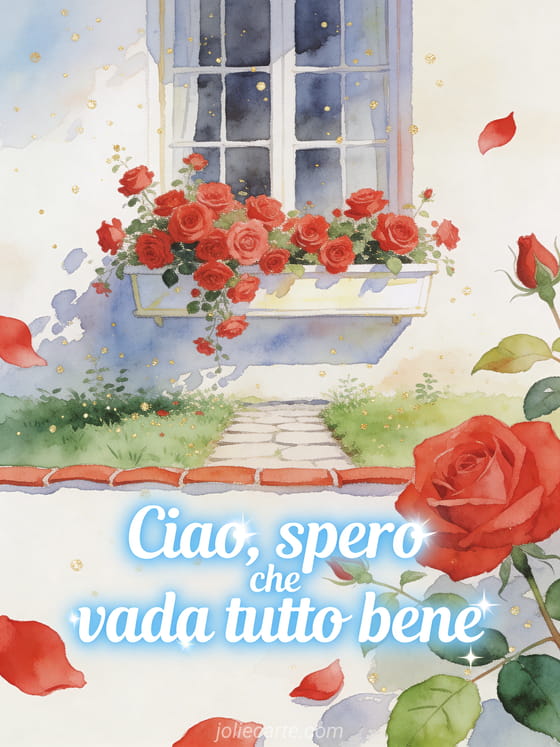 Mostra attenzione con una scena limpida ad acquerello di rose rosse che traboccano da una fioriera luminosa sopra un piccolo sentiero da giardino. Puoi inviare anche come stai mio piccolo tesoro, come stai figlio mio o ciao amore mio come stai.