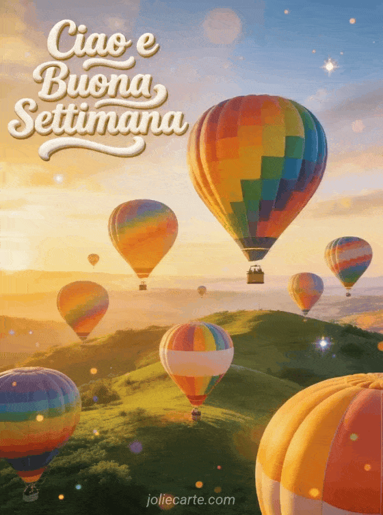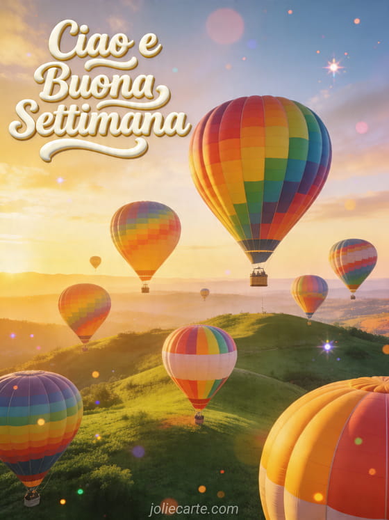 Condividi un ispiratore Ciao e buona settimana con questa cartolina gratis che mostra colorate mongolfiere che si alzano sopra colline verdi all'alba. Scopri anche buona settimana a te, buona settimana baci o immagini buona settimana.