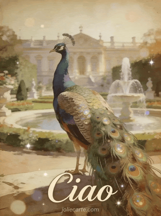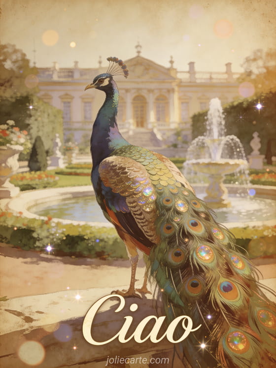 Condividi una bellissima cartolina di ciao con un maestoso pavone che mostra le sue piume colorate in un elegante giardino di palazzo con fontane. Scopri anche una cartolina ape ciao, una cartolina ciao bacino o una cartolina gatto ciao.