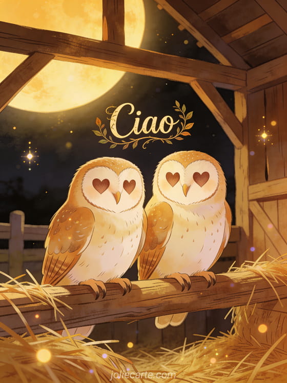 Invia un dolce saluto con questa cartolina raffigurante una coppia di barbagianni in un fienile illuminato dalla luna. Scopri anche una cartolina un piccolo saluto per te, una cartolina ciao caffè o una cartolina ciao buongiorno.